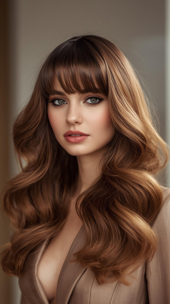 Butterfly haircut with long bangs is a soft and trendy hairstyle. The hair has light layers that give it shape and volume. The long bangs fall gently around the face. They blend smoothly with the front layers. This makes the face look soft and pretty. The shorter layers on top add lift.