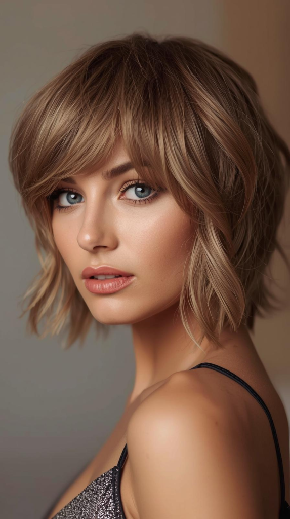 Layered butterfly cut with fringe is a soft and stylish hairstyle. The hairs has light layers that add shape and volume. The fringe falls gently over the forehead. It frames the face in a pretty way. The shorter layers on top give lift and body. The longer layers keep the hairs flowing and natural.