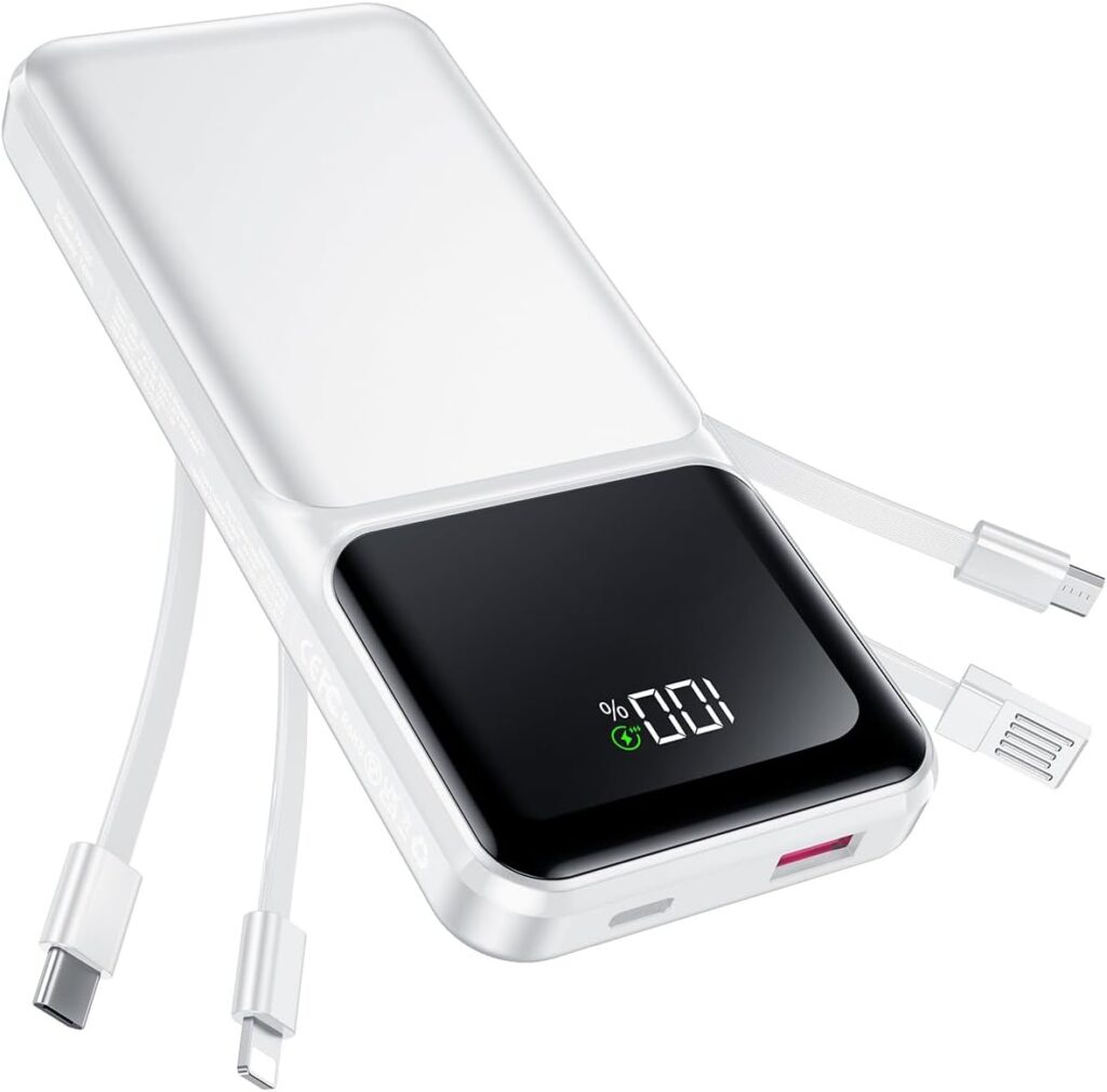 This Power bank has built in cables like USB C, iPhone cable and Micro USB so you do not need to carry extra chargers with you. It has a 10000 MAH battery that can charge your phone a few times. You can charge more then one device at the same time and there are different ways to change the power bank too. It is small and slim and so it easy to carry it fix easily in your bag and pocket.